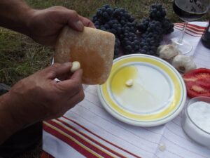 Bagnare la fisca d’aj ant l’oli, rascela sulla micca di pane, sbergnaccarci la tomatica e giunteje la so (intingere lo spicchio d’aglio nell’olio, strofinarlo sulla pagnotta, schiacciarci sopra il pomodoro e aggiungere sale)…come da foto.